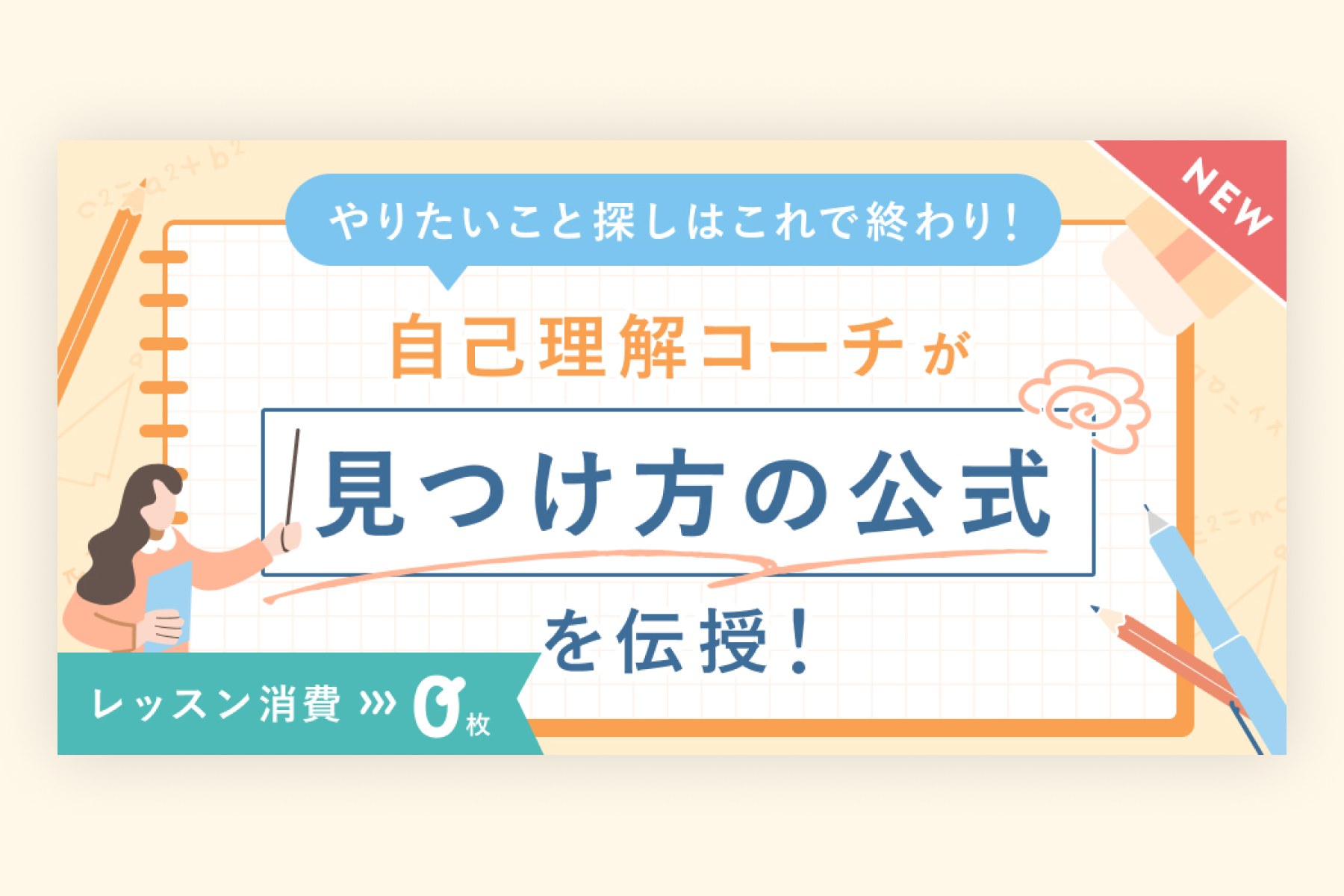 オンライン講座サムネイル(SHE株式会社様) 2025 12/09 バナー ジャンル:バナー制作ツール:Figmaクライアント:SHE株式会社様 会員限定で視聴できる、オンライン講座のサムネイルを制作しました。 クライアントより「見つけ方の公式」がキーワードにあり目立たせたいとのご希望があったため、「学校」「授業」を連想させるようノートや鉛筆のモチーフを使用しました。 バナー